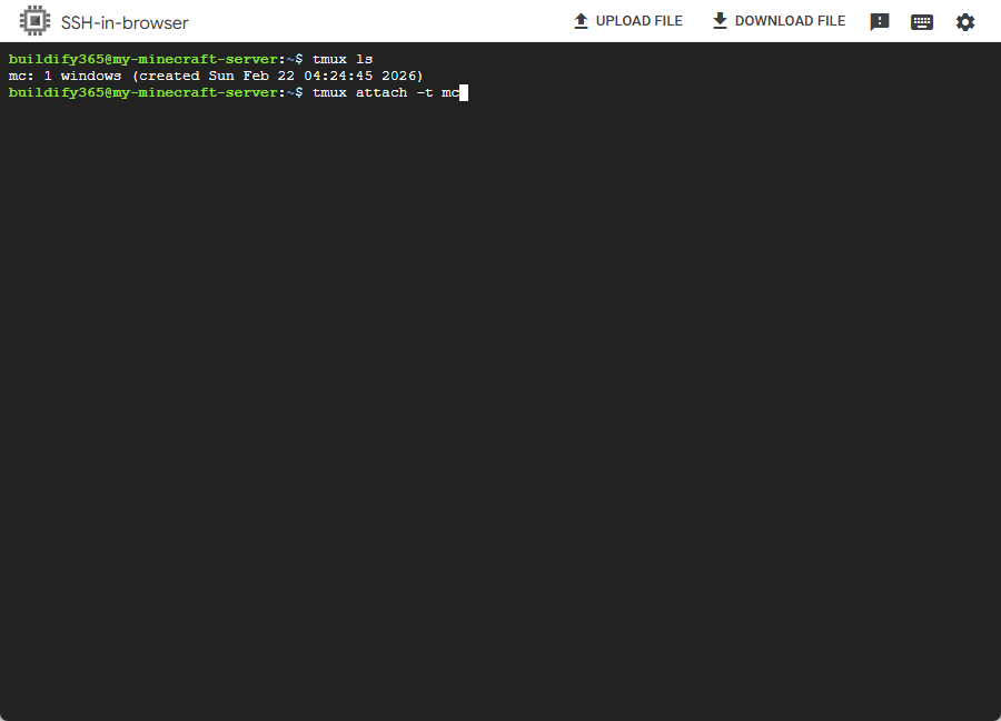 tmux attach -t mc로 서버 세션에 들어갑니다. - 서버 콘솔에