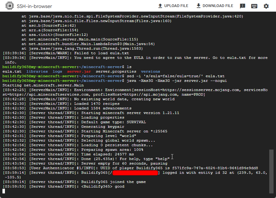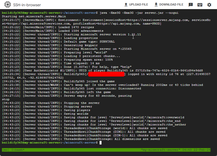 하지만 ssh 브라우저 창을 닫게된다면 수 분 안에 마인크래프트 서버에 접속할 수 없습니다.