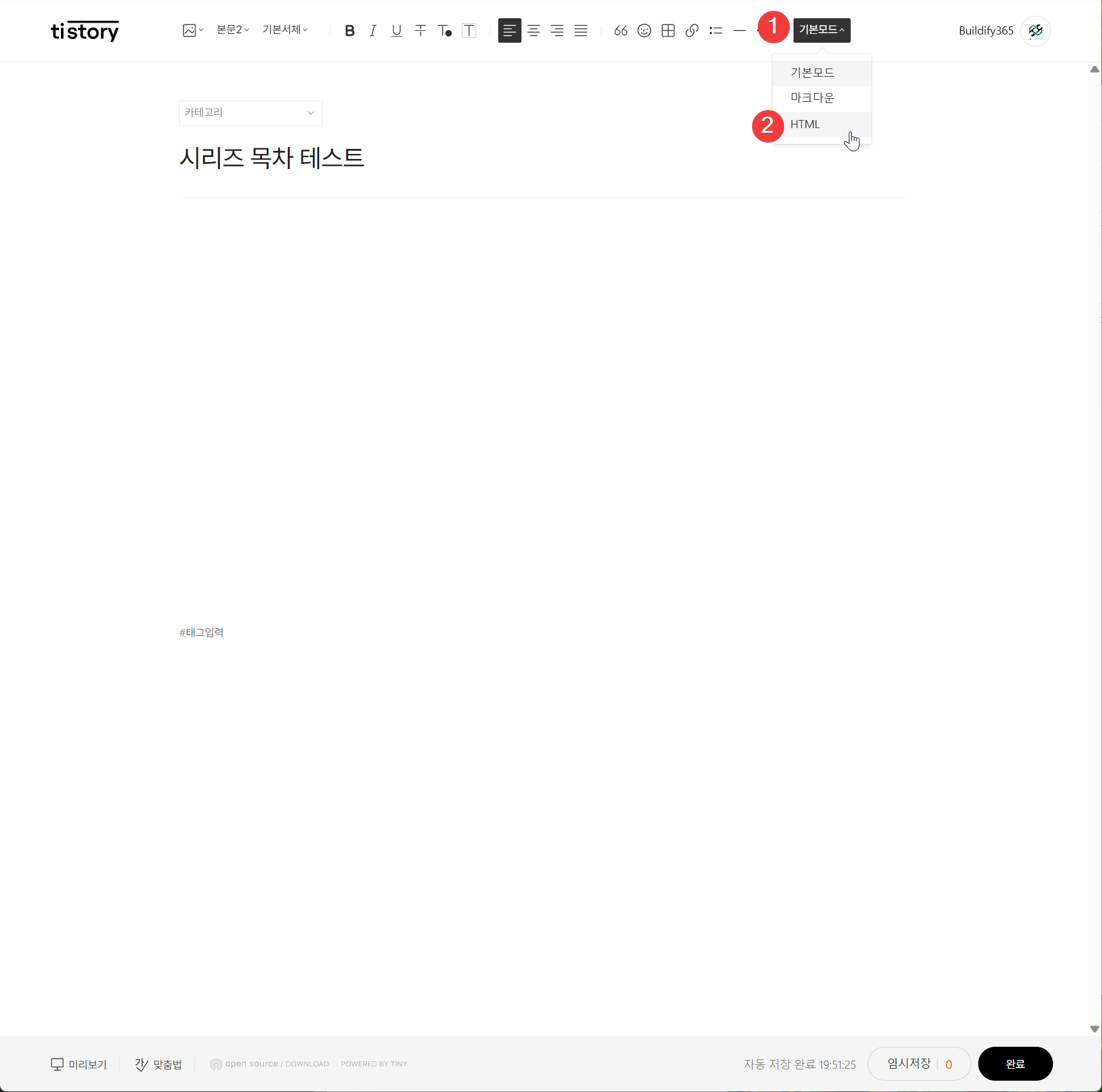 - 티스토리 글 작성 화면에서 우측 상단 HTML 버튼을 클릭해 HTML 모드로 변경합니다 → [이미지 28]