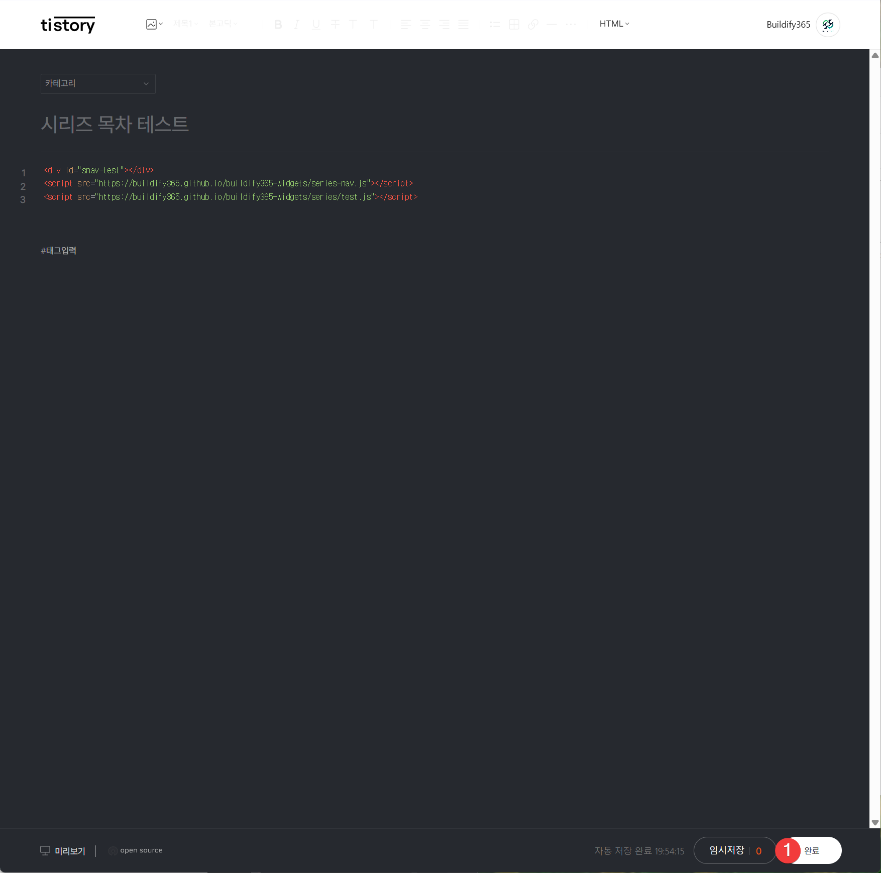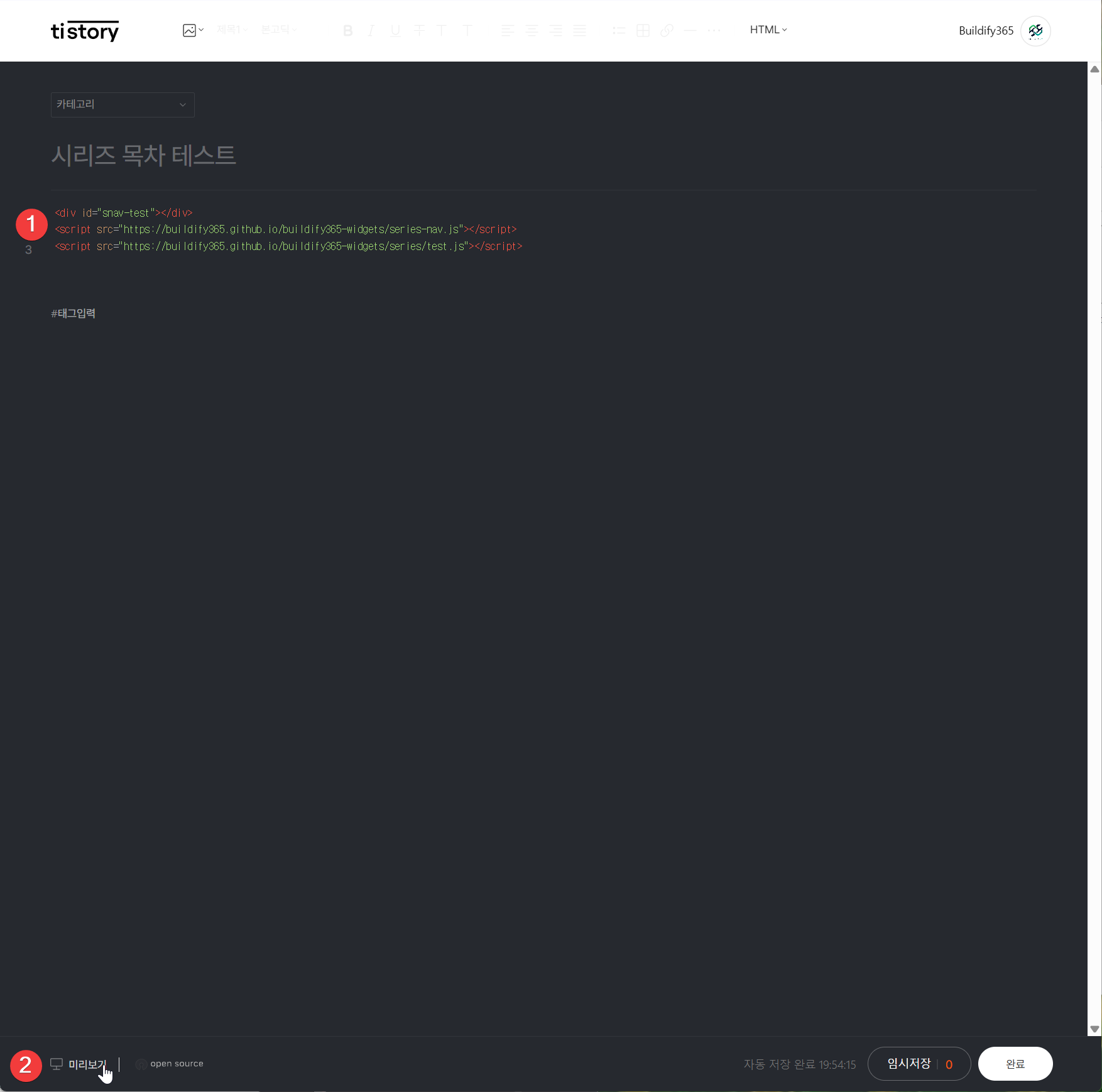 - buildify365 시리즈 네비게이션 생성기로 돌아가서 블로그 삽입 코드 복사 버튼을 클릭합니다 → [이미지 29]