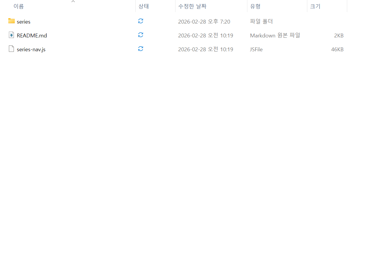 series-nav.js— 렌더링 엔진 (모든 시리즈 공통)series/시리즈ID.js— 시리즈 데이터 (시리즈마다 1개)README.md— 설명서